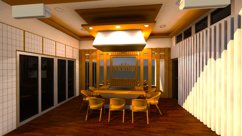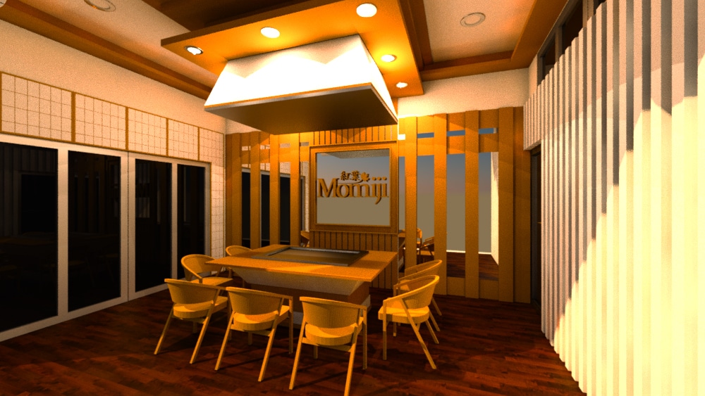 MOMIJI ADALAH SALAH SATU RESTORAN JEPANG BERADA DI CIKARANG, DIA EXHIBITION MENDAPATKAN KESEMPATAN UNTUK MENDESIGN SALAH SATU RUANGAN TEPPANYAKI YANG BERADA DISANA DENGAN SENTUHAN KHAS JEPANG.